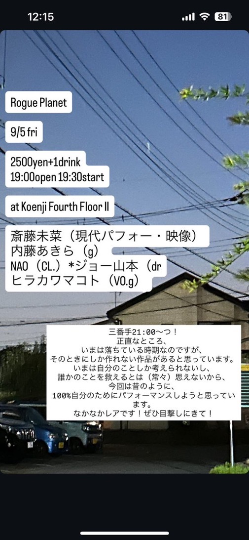 Rogue Planet Sept05 fri 2500yen+1drink 19:00open 19:30start 斎藤未菜(現代パフォー・映像) 内藤あきら(g) NAO(Cl.)×ジョー山本(dr) ヒラカワ マコト(vo.g)